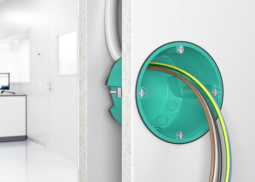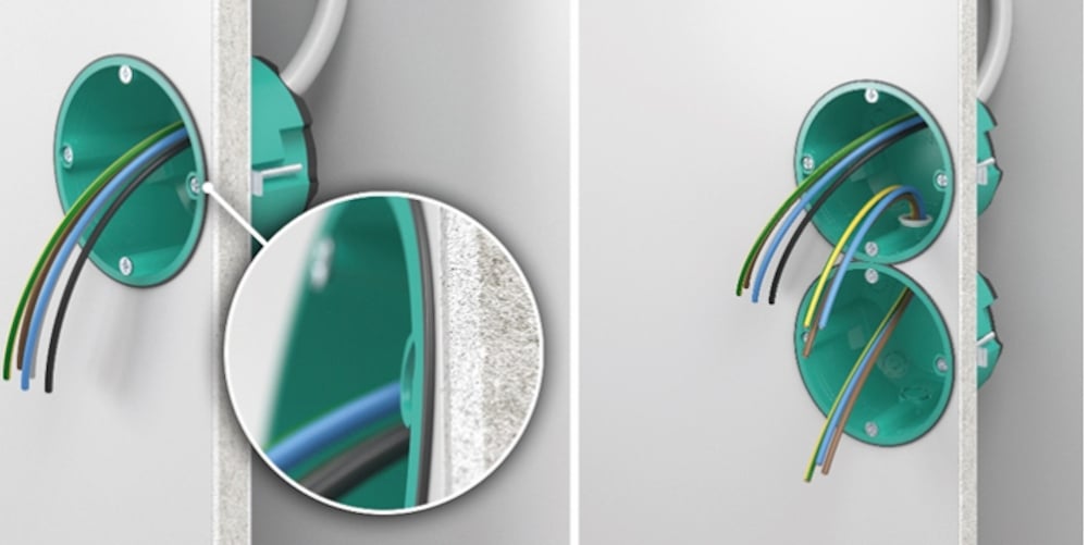 Ausgelegt ist die Verbindungsdose für Plattenstärken von 7 bis 40 mm sowie Installationsöffnungen von 68 mm Durchmesser und Leitungseinführungen bis 11,5 mm Durchmesser. Die komplette Montage lässt sich mit nur einem Schraubenantrieb ausführen.